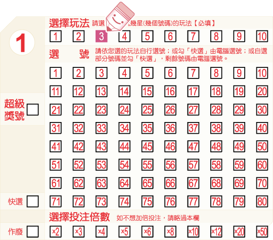 在選號區中,自行從01~80的號碼中填選與您的玩法相對應個數之號碼進行投注。例如,如果您要玩「4星」玩法,則您必須在選號區內填選四個號碼。